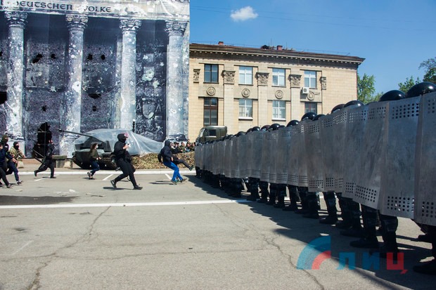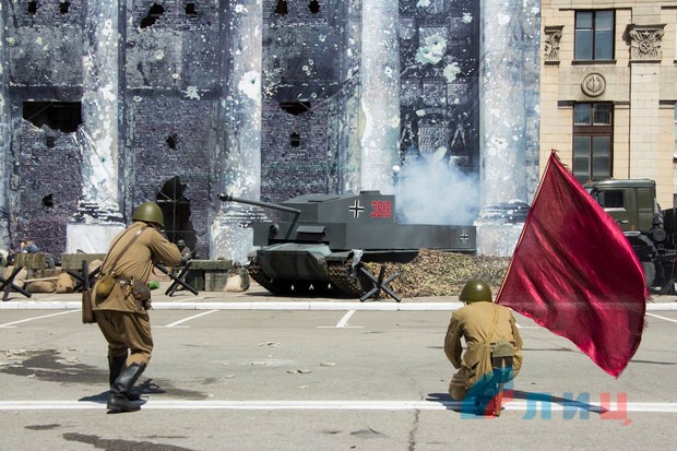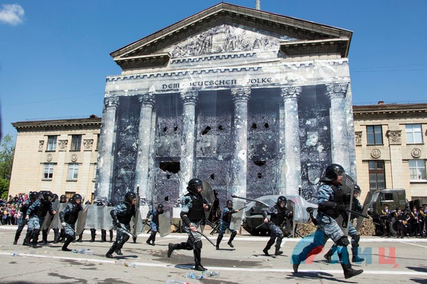 В Луганске здание университета превратили в фальшивый Рейхстаг и имитировали его штурм. А потом на фоне этого Рейхстага имитировали битву "Беркута" с активистами Майдана. Причем больше всего это напоминало не Майдан, а события весны 2014, когда по Луганску эти же самые типочки в масках и бегали, и били сотрудников МВД со щитами.