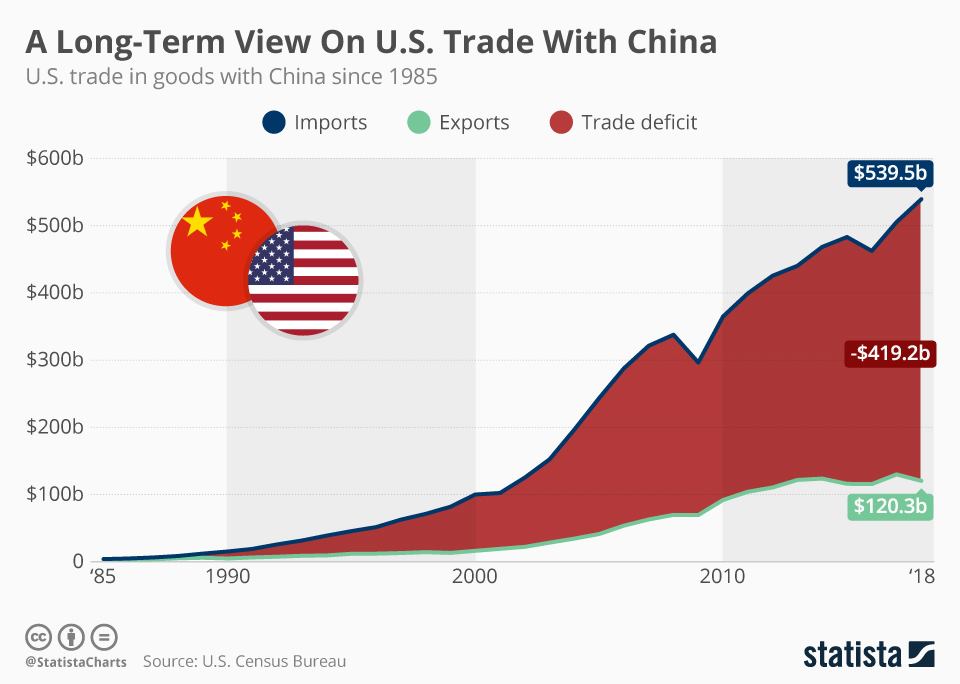 По итогам 2018 года торговый дефицит США с КНР составил 419,2 млрд долларов (см диаграмму).