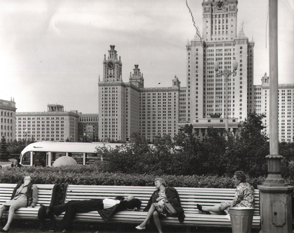 А теперь давайте посмотрим на сами снимки фальшивых нищих, французских подставных бездельников, нетипичных поливальщиц и прочей театральщины, за фасадом которой скрывается блестящий и сияющий СССР шестидесятых годов. Вот та самая фотография МГУ, от которой так бомбануло у капитана очевидности с теплохода "Победа". Даже если представить, что это действительно дурачатся французские туристы, то хочется спросить — ну и что тут такого? Только мозг, воспалённый советской пропагандой, мог достроить действительность, в которой эту фотографию во Франции будут выдавать за снимки "советских безработных".