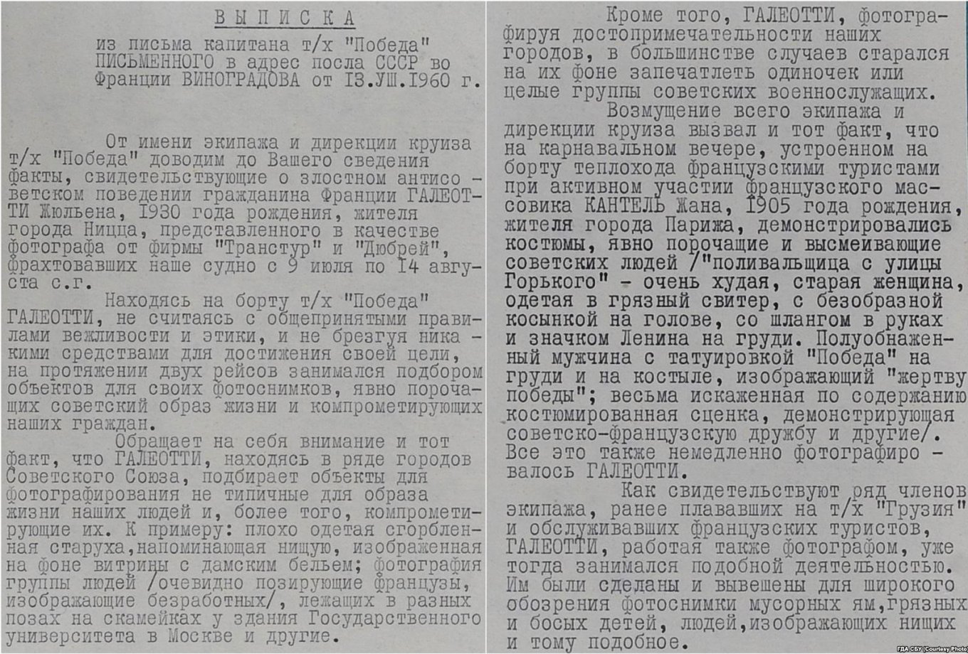 Для начала немного предыстории. О том, что Галеотти был "под колпаком" ещё в свои предыдущие приезды в СССР (задолго до 1963 года), говорит вот такая выписка из письма капитана теплохода "Победа", что была написана в июле 1960 года. Тут прекрасно всё — капитан пишет о том, что гражданин Галеотти "занимался подбором объектов для своих фотоснимков, явно порочащих советский образ жизни и компрометирующих наших граждан". "Находясь в ряде городов Советско Союза, Галеонни подбирает объекты для фотографирования, не типичные для образа жизни наших людей — к примеру, плохо одетая, сгорбленная старуха, напоминающуя нищую, очевидно позирующие французы, изображающие безработных у здания МГУ и другие".