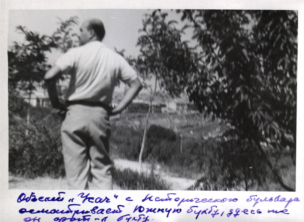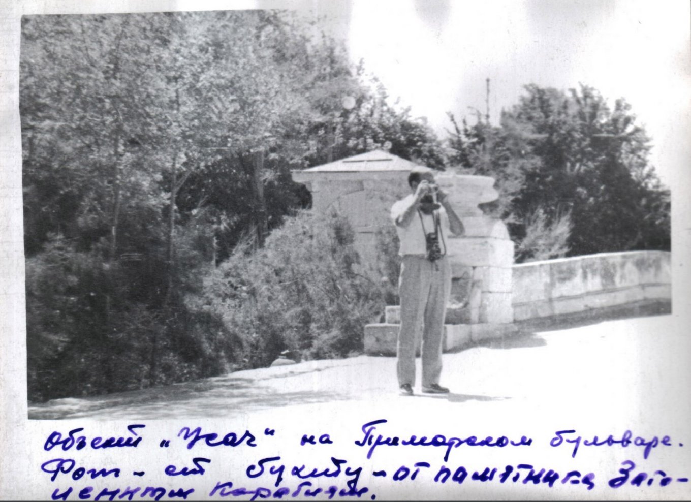 А вот и сам Жульен, попавший в мыльные телеобъективы советских пинкертонов, зорко следящих, как бы он тут чего нам не очернил. Надпись на снимке — "Объект "Усач" с исторического бульвара осматривает Южную бухту, здесь же он фотографировал бухту". Найти и обезвредить!