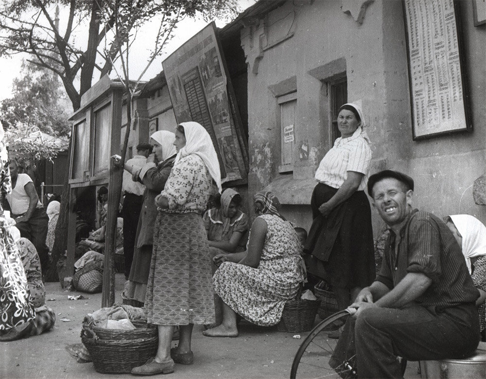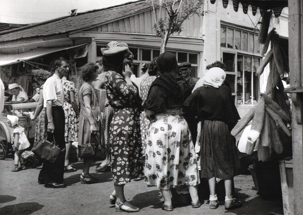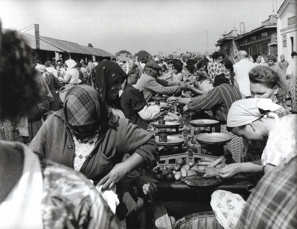 Рынок в Одессе, 1963 год. Вот так выглядели граждане в "стране победившего социализма" — которым, по словам Хрущёва, до Коммунизма осталось всего 17 лет. Видимо, в 1980 году все эти бабушки на рынке должны были бы отдавать свою картошку бесплатно всем желающим.