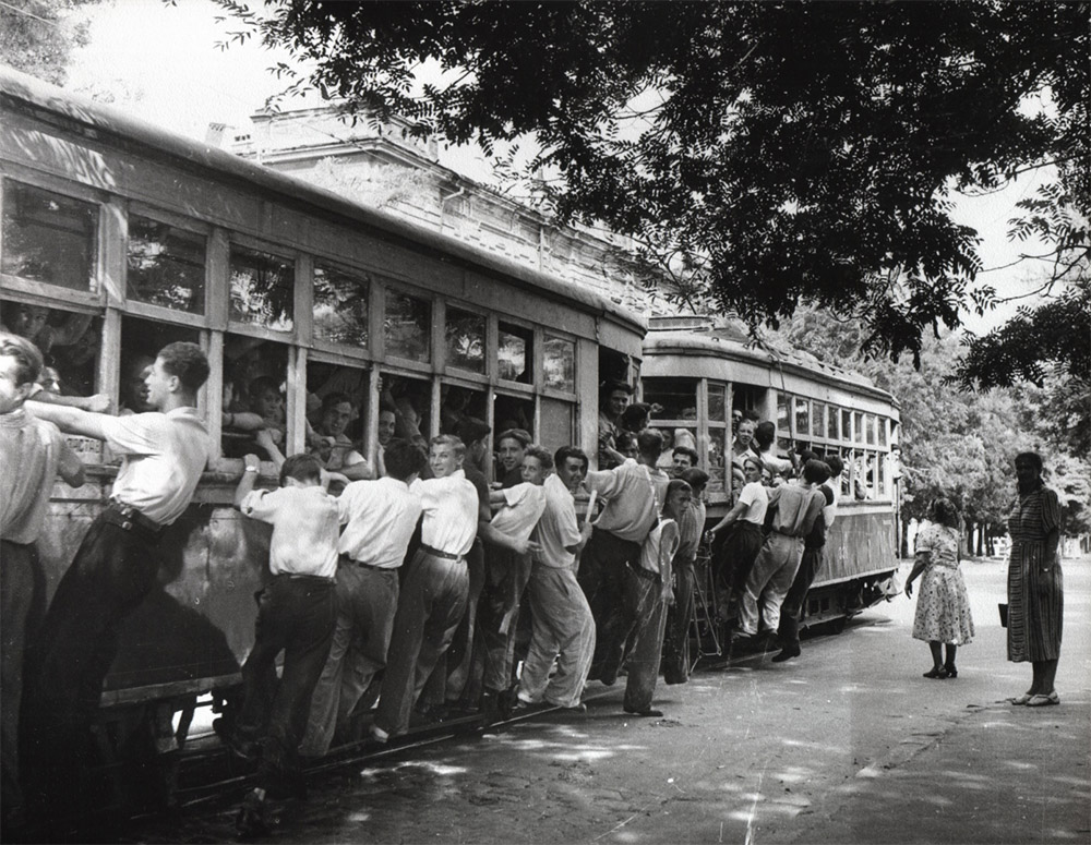 А мы тем временем идём дальше вместе с Жульеном. Вот этот фотоснимок называется "Остановка общественного транспорта", сделан он в том же 1963 году. Вот это очернил так очернил! "Не смотрите на фото, все здания в кадре — подделка Госдепа, а все люди в кадре — французские актёры" — кричит копетан с "Победы".