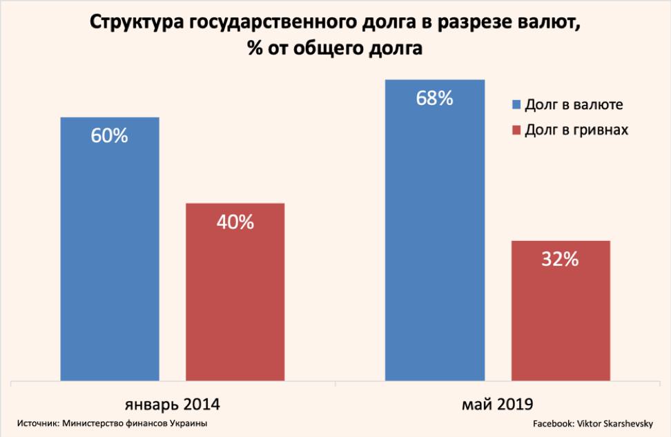 Более того, при общем резком увеличении госдолга, ухудшилась валютная структура государственного долга (доля долга, номинированного в валюте возросла с 60% в начале 2013 до 68% в апреле 2019), что увеличивает риски по обслуживанию и погашению госдолга в результате неизбежного ускорения девальвации (см. График 2).