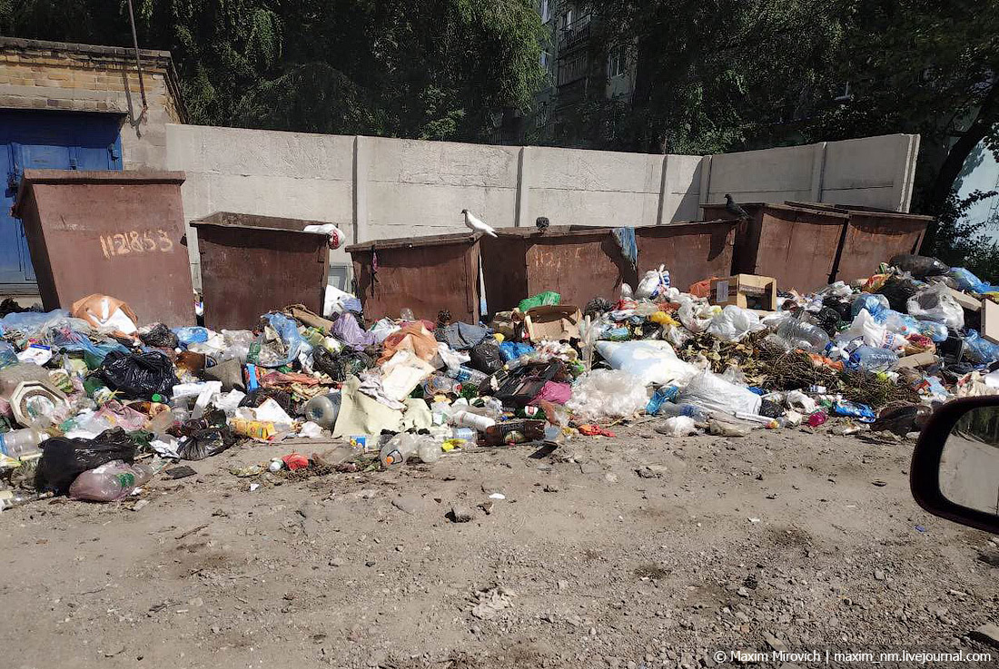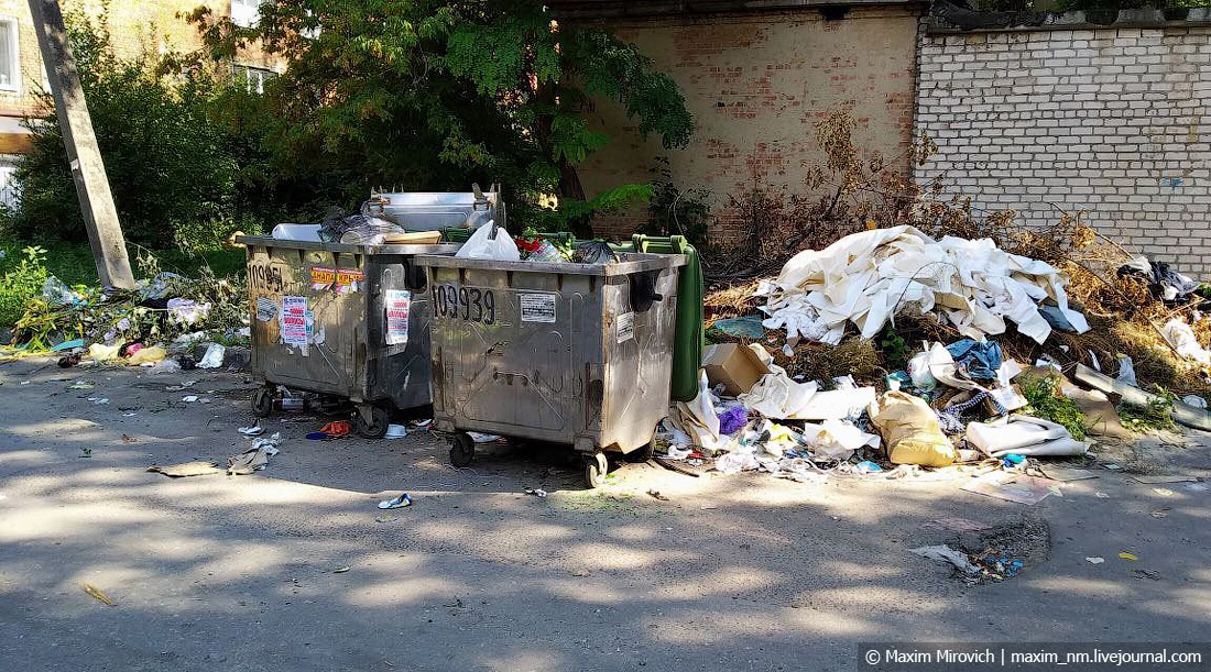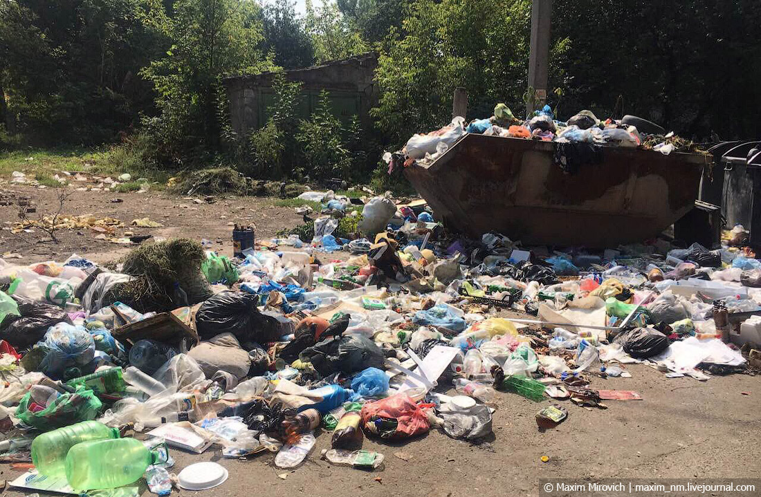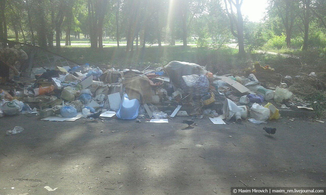 Ещё один двор Луганска. Кстати, обратите внимание на то, что ничего более-менее "ценного", вроде старых башмаков или поломанного кресла в мусоре нет — это либо не выбрасывается вообще, либо тут же растаскивается местными жителями как ценные и ещё хорошие вещи, которые можно починить с помощью синей изоленты и подшивки журналов "Наука и жизнь" за 1986-88 годы.