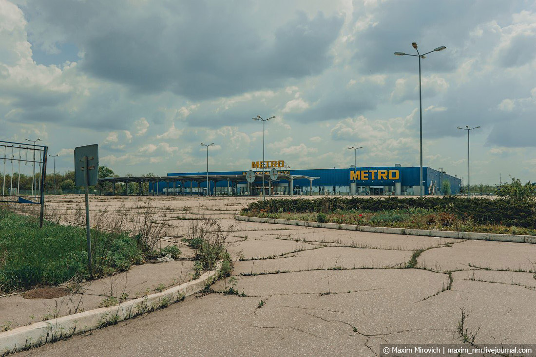 Луганский "Metro" был примерно также разграблен и закрыт, близко подъезжать к нему сейчас запрещено — возможно, внутри находятся какие-то склады или даже военная база боевиков. Подъезды к гипермаркету выглядят вот так:
