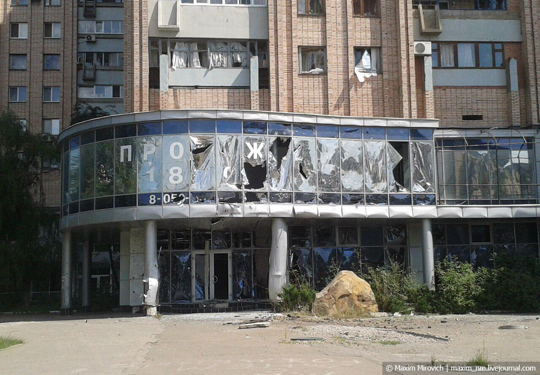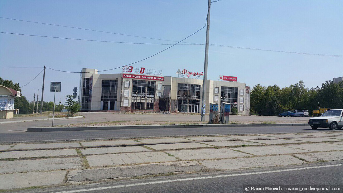 Центр Луганска, район Краеведческого музея — неработающий и разбитый двухэтажный магазин в виде пристройки к кирпичному жилому дому, вокруг всё зарастает травой и начинает напоминать Припять. Обратите также внимание и на сами квартиры в жилом доме — они частично брошены, дом опустел. Двухкомнатную квартиру в Луганске в районе Восток можно сейчас купить в районе $10000 или даже дешевле, сбыласть мечта всех любителей СССР — квартиры в Луганске стали почти бесплатными.