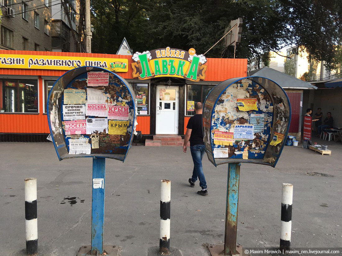 Обратите внимание также и на объявления на переднем плане фото. — они расклеены в бывших будках таксофонов "Укртелекома" — таксофонов давно нет, их украли — и теперь клеют там объявления. Объявления в основном предлагают автобусные перевозки в Москву и Крым.