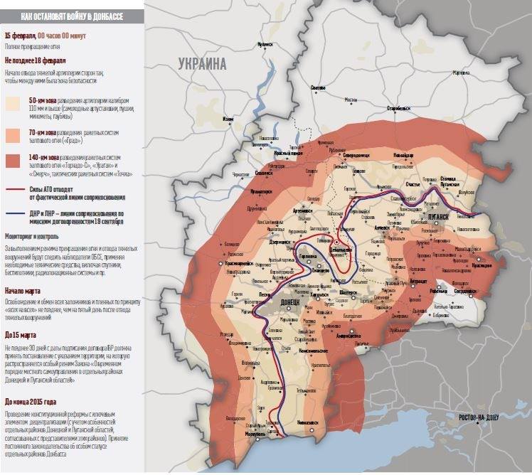 Уже много раз об этом писал, и повторюсь еще раз. Дебальцево, согласно минским соглашениям, должно оставаться под контролем украинского правительства. Следовательно, когда начнется разведение войск на этом участке, вооруженные формирования ДНР должны будут оставить этот город и отойти подальше к Енакиево (на карте это синяя линия).