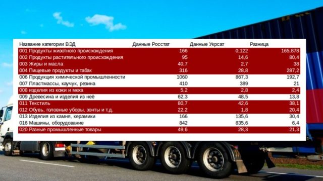 А теперь для иллюстрации приведу таблицу разницы Украинской и российской статистики по данным товарным категориям.