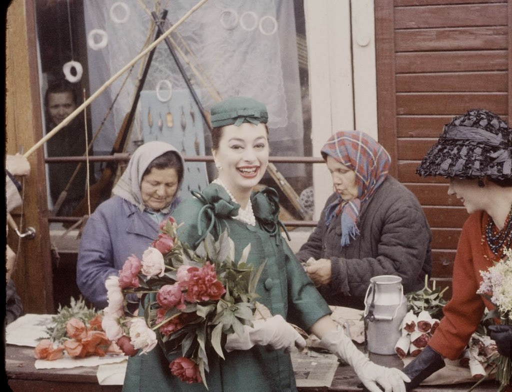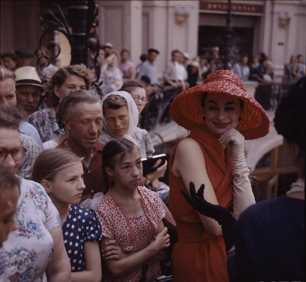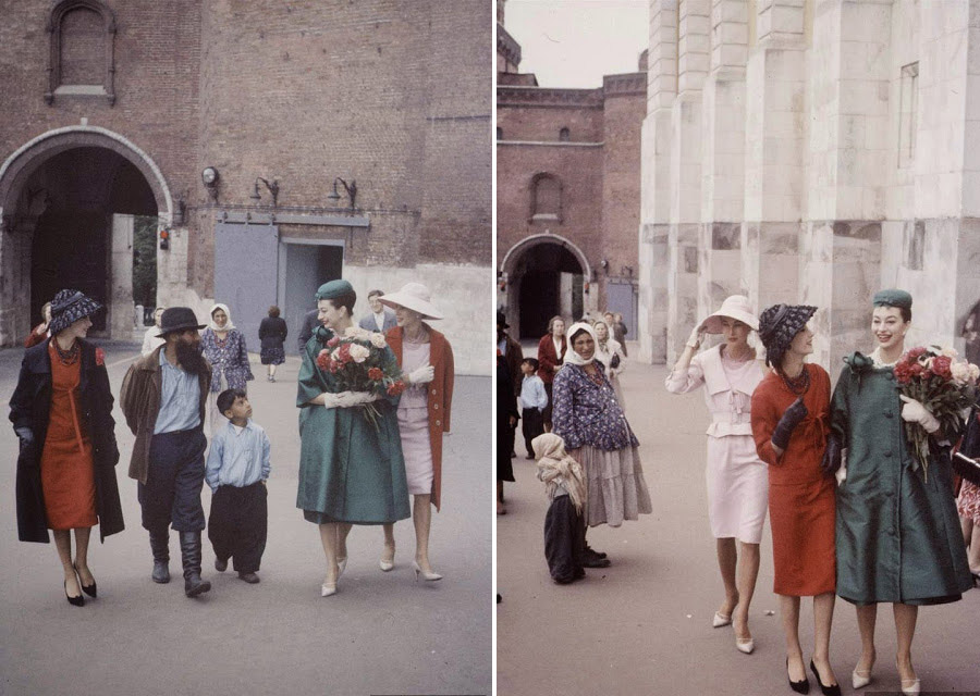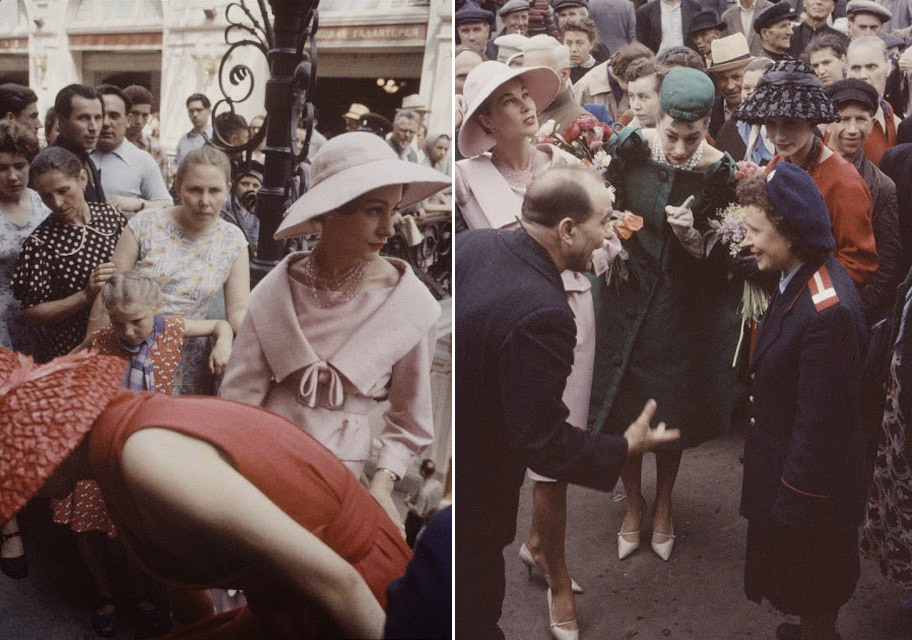 Сказать, что эти фотографии шокируют — это не сказать ничего. Среди серых и мятых совковых граждан, одетых в бесформенные плащи и ватники, француженки смотрятся даже не приезжими из другой, более развитой страны — они выглядят пришельцами из другой эпохи. Или пришельцами с другой планеты — что в общем-то почти то же самое. И примерно так же, как аборигены, ведут себя на фото советские граждане — смотрят на моделей со смесью ужаса и восторга, украдкой пытаясь пощупать уголок ткани диковинного платья.