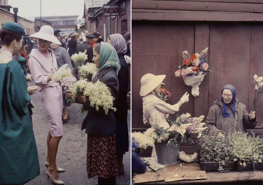 Серия снимков, запечатлевшая моделей на каком-то стихийном рынке. Тут примечательно всё — и убогие деревянные торговые ряды, и банки совковых консервов, рядами возвышающиеся в на втором кадре, но примечательнее всего лица женщин там же — обратите внимание, как они разглядывают наряд француженок. Что интересно — советские дамы на фото не намного старше французских леди, но насколько же по-разному они выглядят! Лица, осанка, ноги, одежда... СССР стоило развалить только за то, что в нём женщина после 35-40 лет забывала о том, что она женщина.