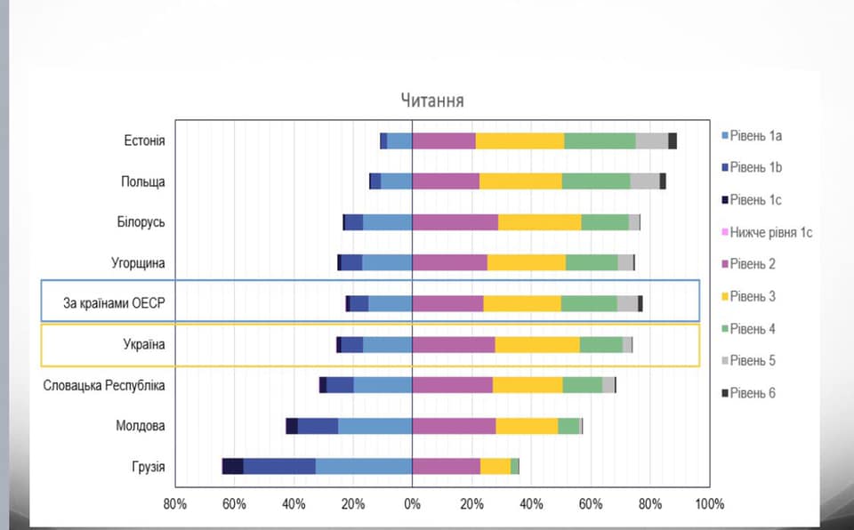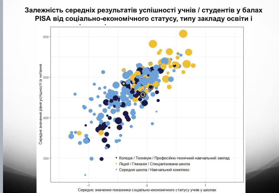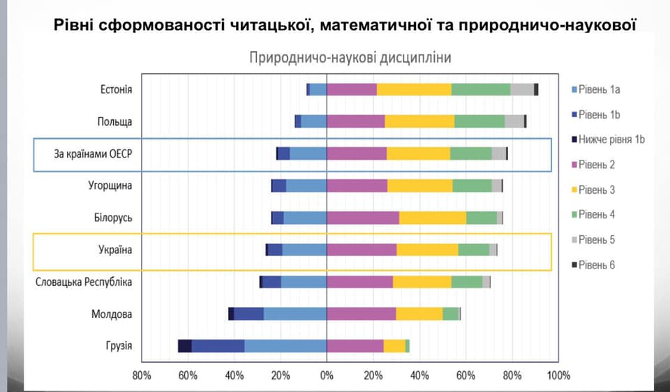 Показники успішності українських підлітків є значно нижчими за середні значення по країнах ОЕСР. Навіть базового рівня читацької грамотності не досягли 25,9 % наших підлітків, природничо-наукової – 26,4 %, а математичної - аж 36 %. Україна на тлі інших схожих країн має особливі проблеми з математикою у більшості учнів. Тож 15-річні учні і студенти відстають від своїх однолітків у навчанні на 1 рік в середньому по ОЕСР.