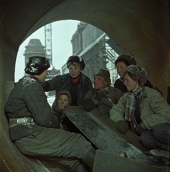 Ещё трудовые подвиги, очень хороший постановочный кадр. На заднем плане — производственные мощности какой-то кузницы коммунизма, люди проводят совещание в какой-то трубе и слушают бригадира, улыбаясь от счастья и предстоящей радости труда.
