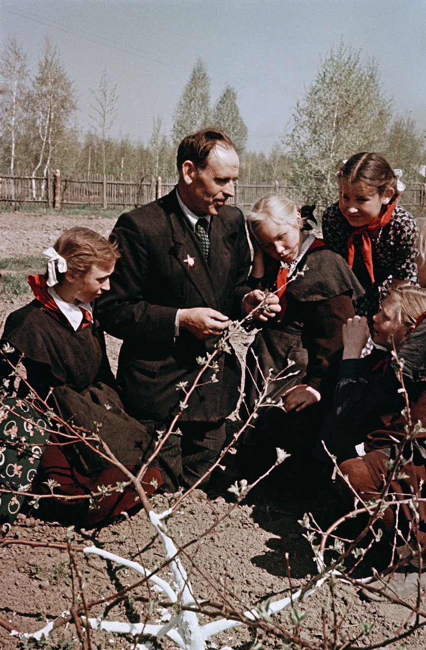 Со времён первых картин с культом Ленина, когда вокруг Вождя собиралась толпа детишек и слушала его открыв рот, в советской постановочной фотографии был также популярен сюжет, когда дети собираются вокруг "старшего товарища" и учатся жизни. Вот например какой-то ответственный (и явно партийный товарищ) рассказывает детям о деревьях: