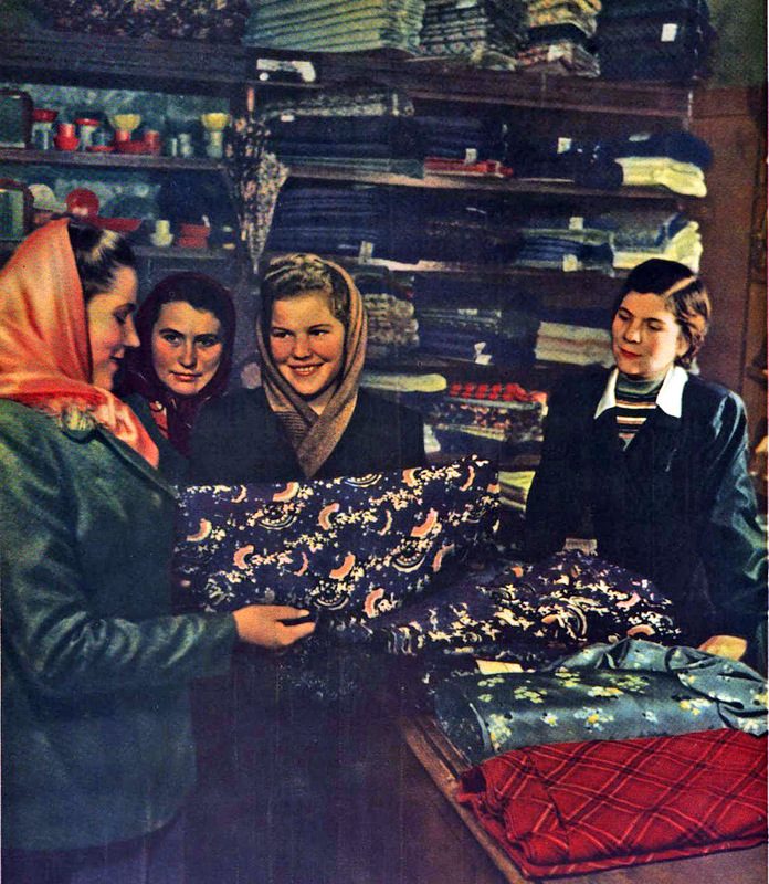 Итак, начнём. Первое фото — советский универмаг пятидесятых годов. В те времена, кстати, продавалось не так и много готовой одежды, были популярны так называемые "отрезы ткани", которые покупали для пошива платьев и костюмов — на фото как раз такие. Ну и разумеется, в кадре все улыбаются.