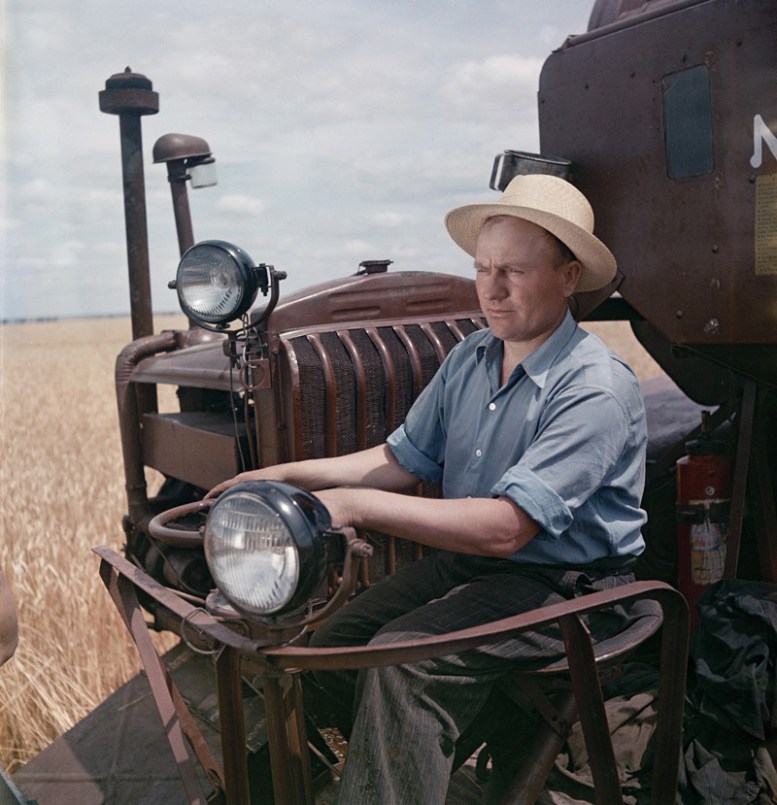 Комбайнёр в поле. Так и представляю напутствие фотографа: "Петрович, сядь ровно и сделай такое лицо, словно ты смотришь вдаль и одновременно думаешь о коммунизме":