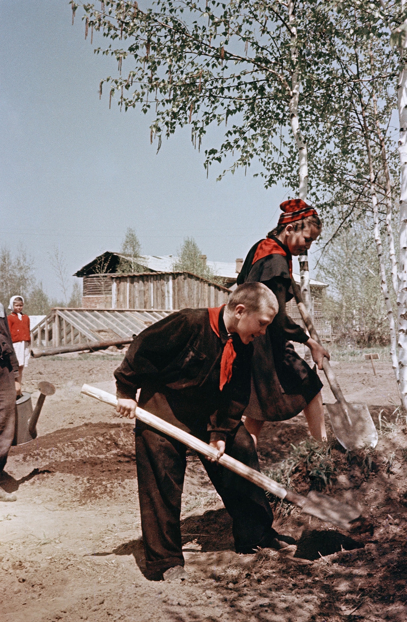 Школьная тематика. Ученики, открыв рты, слушают пионервожатую, которая указывает им светлый путь к коммунизму на штору. Если на советских фото 1950-х годов снята школа, то там всегда акцентируется послушание учеников — они идут строем или сидят ровными рядами и внимательно слушают учителя.