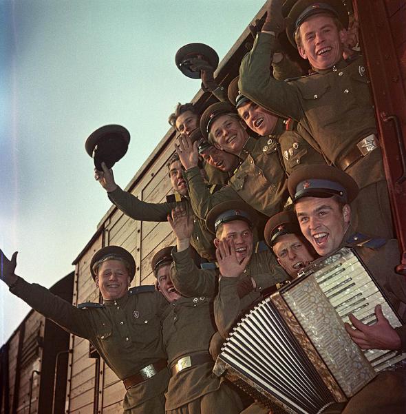 Ну и напоследок — постановочное фото советской армии, где разумеется все были счастливыми и весёлыми. Примерно в это же время (в 1957 году) в советской армии погиб старший брат моего отца — о таких случаях людям не сообщали ничего, публикуя вместо этого в журналах вот такие фотоснимки...