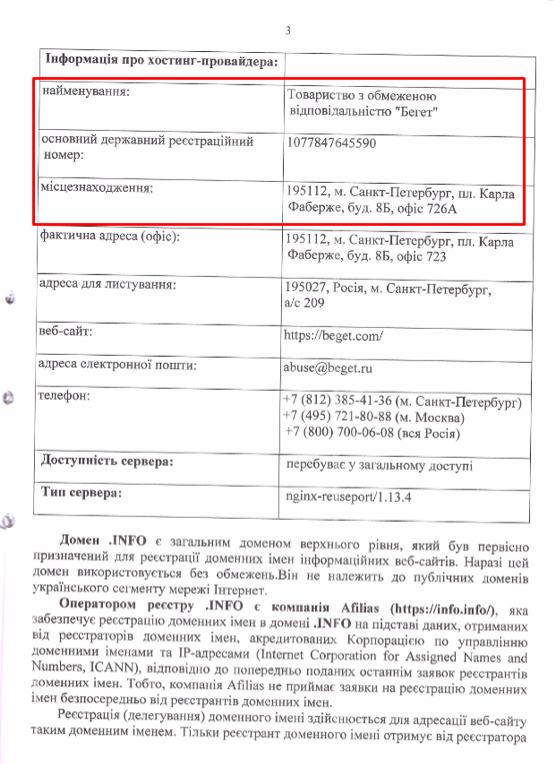 1. Сайт «chornovol.info», на якому пані Тетяна публікує свої псевдовикривальні матеріали, розміщується та адмініструється – де б ви подумали? На серверах країни-агресора, в Російській Федерації. А саме - у місті Санкт-Петербурзі, за адресою: площа Карла Фаберже, б.8/б, оф. 723.