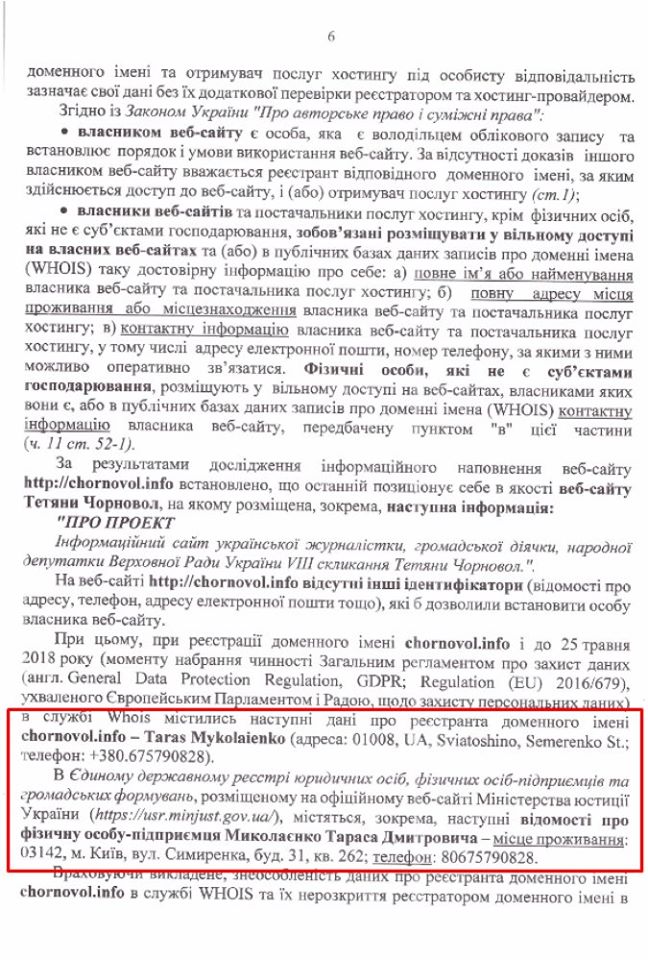 Сайт «chornovol.info» зареєстрований не на саму Тетяну Чорновол, а на фізичну особу-підприємця Миколаєнка Тараса Дмитровича зі Святошина.
