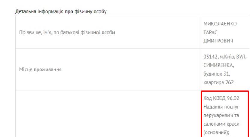 У відкритому реєстрі юридичних осіб і фізичних осіб-підприємців ми знайшли таку особу, дані і адреса реєстрації якої співпадає з власником сайту пані Чорновол. І виявилося, що Тарас Дмитрович надає перукарські послуги.
