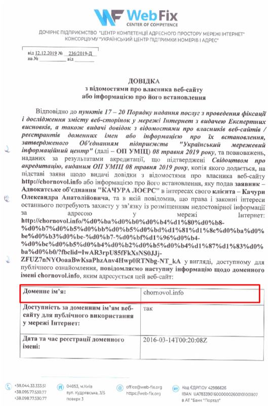 Інформація про розміщення серверів chornovol.info підтверджена офіційними документом з Українського центру підтримки номерів і адрес.