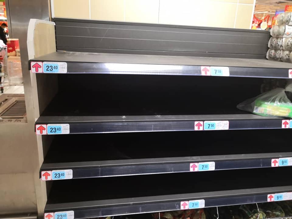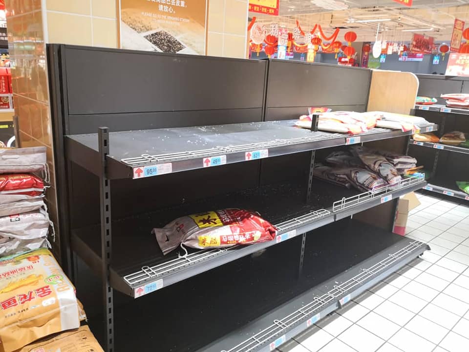 Живет он в Хуаду, пригороде Гуанчжоу. Кстати, население Хуаду примерно 700 000 человек, а Гуанчжоу 14 000 000. От Хуаду до Ухани примерно 1000 км. Местные жители знают, что проблема с эпидемией есть, но массовой паники нет. Все в курсе, что китайское правительство работает над её решением. Правда жизнь поменяла свой привычный уклад. Например, на фото отделы овощей, риса и яиц в одном из самых больших супермаркетов. А эти продукты тоже самое для китайцев, как для нас гречка, макароны и соль, которые выносят с полок в первую очередь. А вот другая еда и алкоголь пока есть в ассортименте.