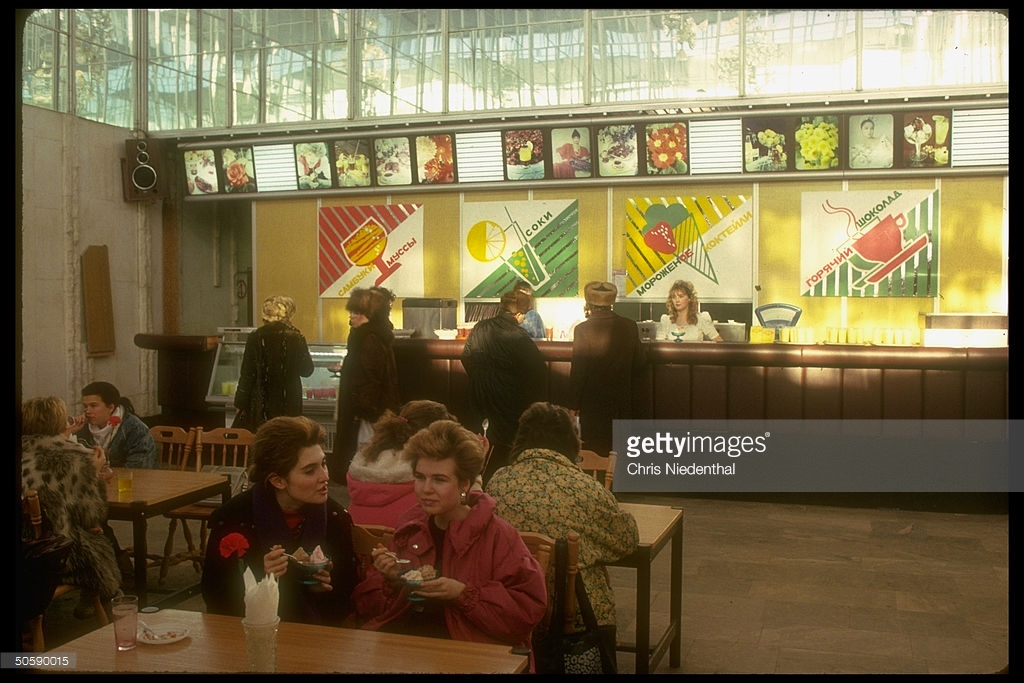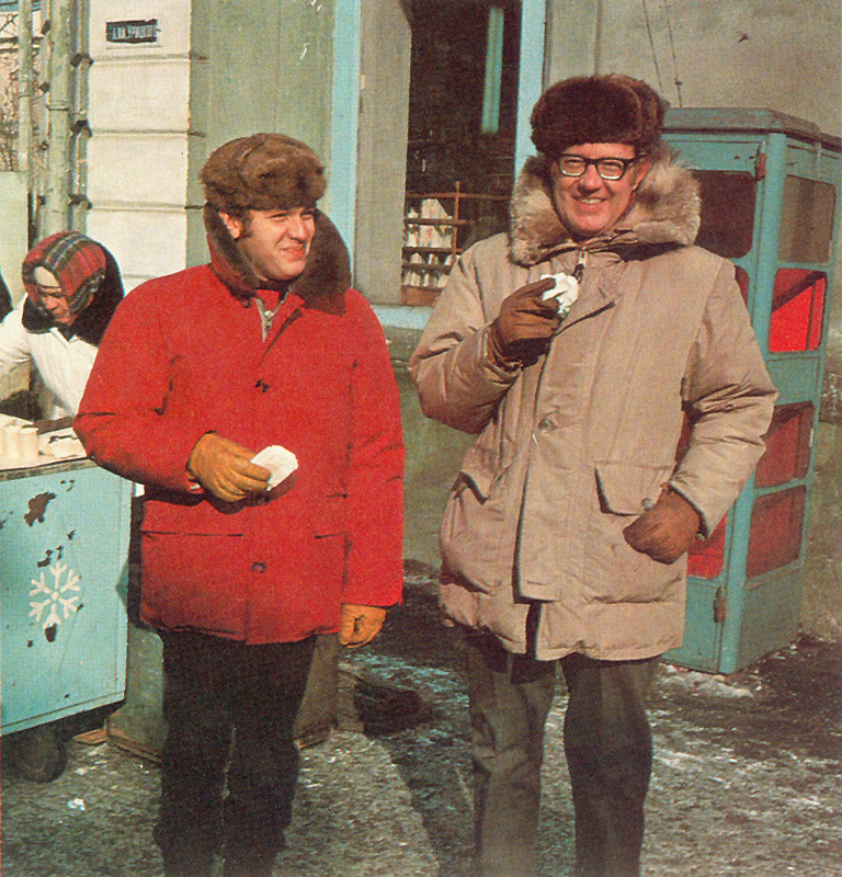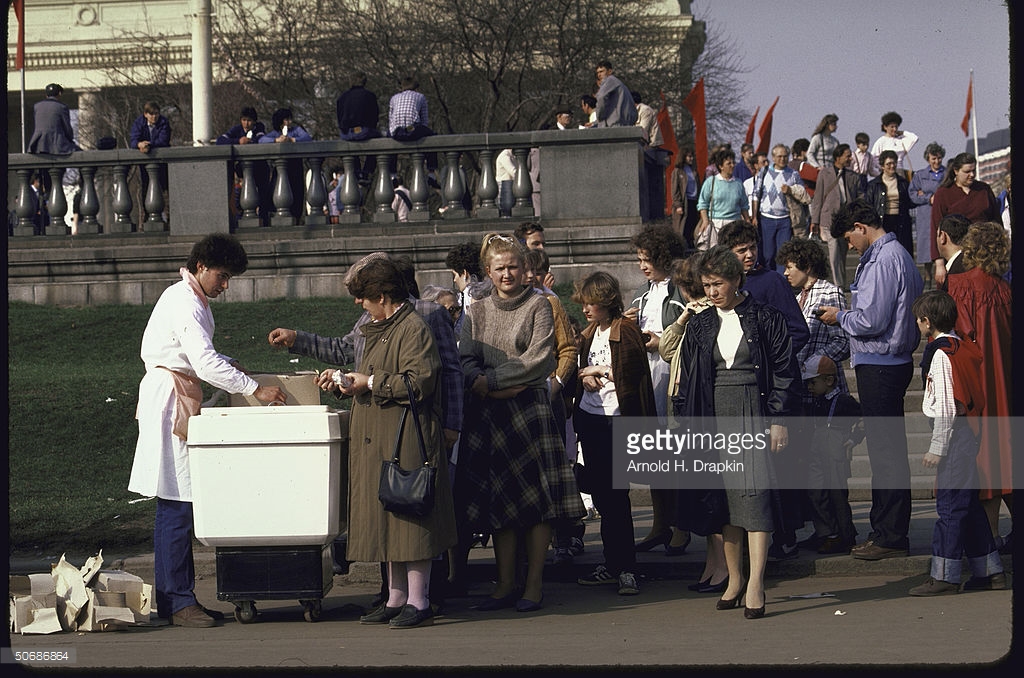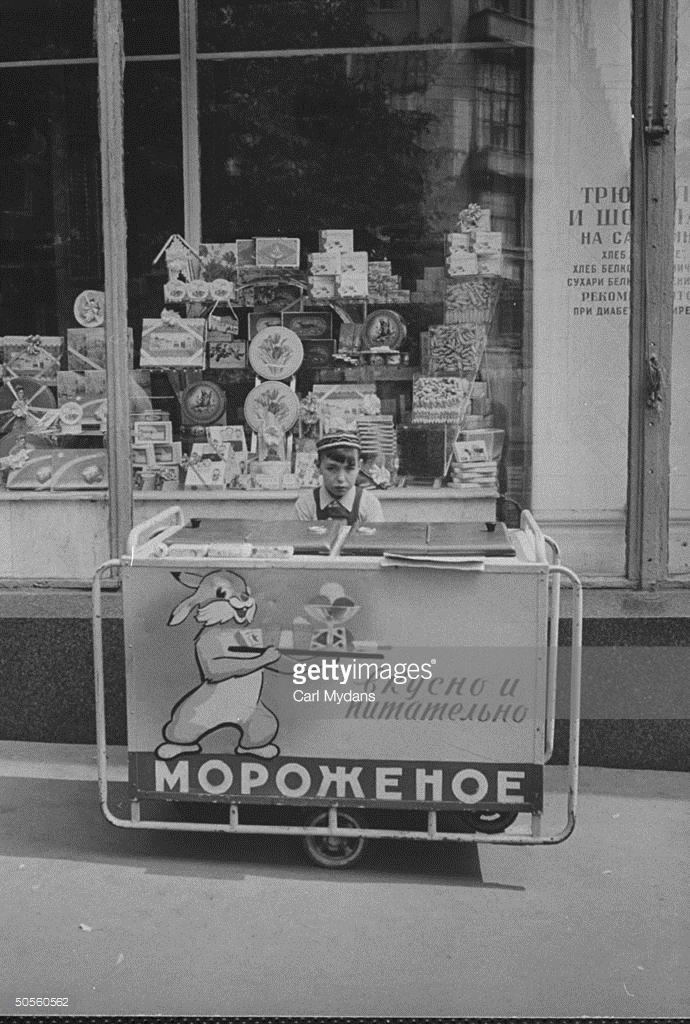 Зимнее фото советских граждан у лотка с мороженым, сделанное тем же Дином Конгером. В руках у советских граждан, вероятнее всего, популярное в те годы "сливочное мороженое" — оно продавалось в таких прямоугольных пачках, похожих на маргарин, и было с двух сторон покрыто вафлями; кушать мороженое нужно было удерживая с двух сторон пальцами и постепенно разворачивая упаковку.