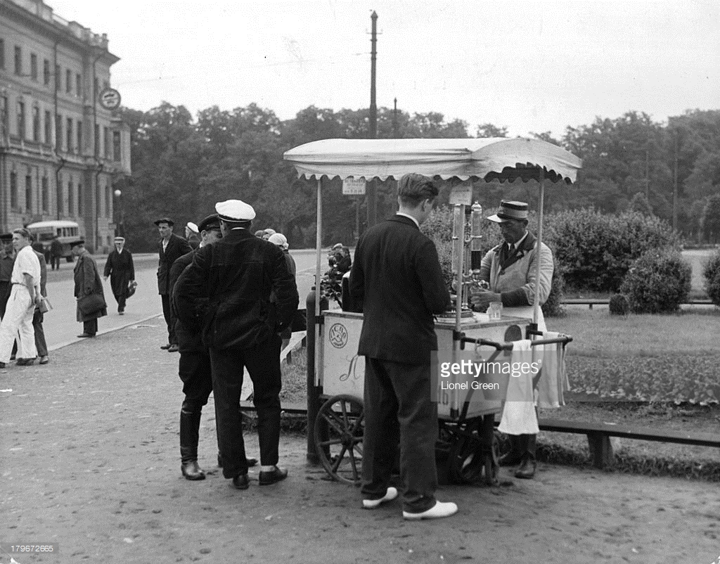 Иногда продажу мороженого совмещали и с продажей других "вкусностей". К примеру, вот у этого лотка с мороженым есть ещё функция приготовления воды с сиропом. Фото сделано в Ленинграде, год не обозначен, но предположу, что снимок сделан не позже 1950-х годов.