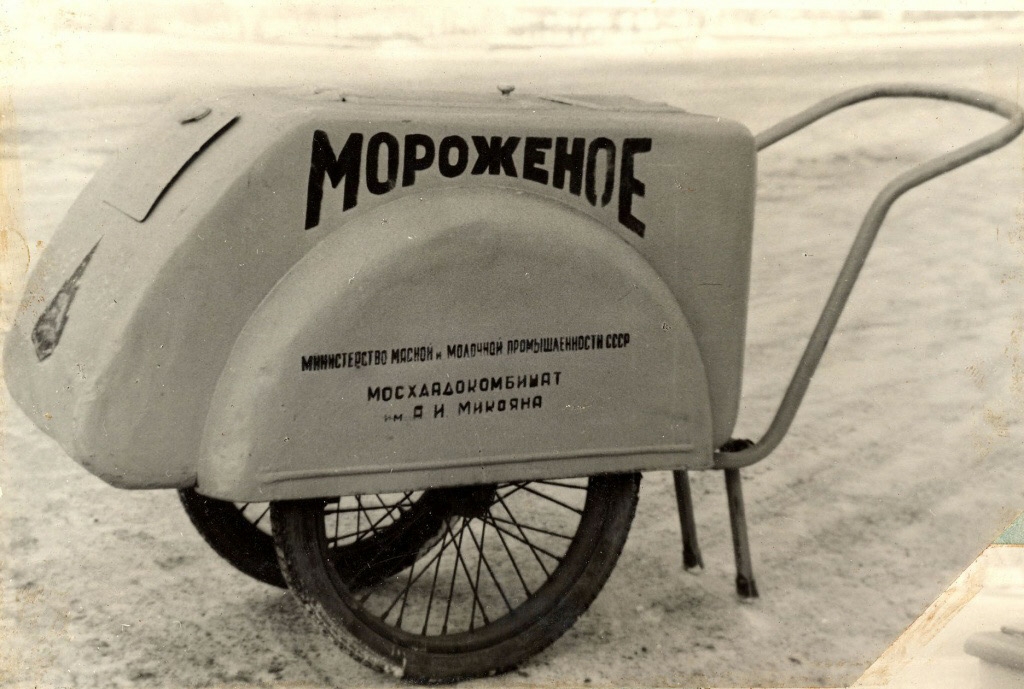 Фотоснимок Дина Конгера, американского фотографа — на фото запечатлена уличная продажа мороженого из специального ящика с изолирующими стенками, в котором мороженое не таяло; снимок сдела в центре Москвы (возле ГУМа) в 1960-е годы. Дин Конгер, кстати, очень любил снимать всякие бытовые сюжеты, связанные с едой — у него полно снимков советских застолий, автоматов по продаже газировки, уличных бочек с квасом и т.д., кто интересуется темой — рекомендую к ознакомлению.