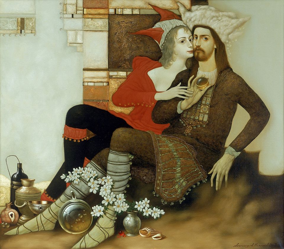 Кто они, герои Александра Мельникова? В чем их магнетизм? Автор немногословен, приглашает зрителя размышлять самостоятельно и лишь подчеркивает, что в работах никогда не встретить портретов конкретных людей. Все образы – собирательны. Один из основных героев его работ – рыцарь. Мужские образы, переходя из работы в работу, неизменно облачены в рыцарские доспехи и латы – как символ мужественности и отваги, символ, дающий понять, что изображен защитник, человек, принимающий решения и берущий ответственность. Если углубиться в анализ отдельных работ, то можно встретить отголоски рыцарских повествовательных романов и встретить на холсте элементы той эпохи – то меч короля Роланда, а то и чашу Грааля. Часто встречаются патриции – мужи, преисполненные мудрости, достоинства и чести, в соответствующих аристократическому статусу одеяниях. В основной массе картин мужские образы возникают в контексте присутствия Прекрасной Дамы – женского образа, которых в творчестве Александра Мельникова большинство. Прекрасные Дамы – музы, подруги, любовницы, соперницы – все они восхитительны и обозначены неземной невесомостью и одухотворением. Каждая из них одарена художником прекрасными чертами лица и царскими одеяниями. Каждую из них сопровождает история, сказка, легенда, написанная как здесь и сейчас, так и много тысячелетий тому назад. Холст «Колдунья» (2011) мы вполне можем соотнести, например, с мифической Каллипсо, на много лет чарами пленившей Одиссея на своем острове. У «Колдуньи» Мельникова все тот же традиционный колдовской набор – мистические шары, сосуды с магическими зельями, морские раковины, способные вызывать в человеке галлюцинации и безумие, а также животное у ног – как символ тварности и плоти всего живого. В «Колдунье» Мельникова животное – леопард, коварно и опасно. Оно может погубить человека. Художник не иллюстрирует конкретную легенду, он лишь пытается помочь понять те составляющие, которые существуют в мире. И то, что они внешне прекрасны, не умаляет истинной ужасающей составляющей объекта и не списывает недостатки за счет достоинств. В картине четко прочитывается буквально священный ужас самого автора, пытающегося предупредить и упредить. Все это – в ярко-красном фоне и в полутенях-полуфигурах, которые можно читать на заднем плане.
