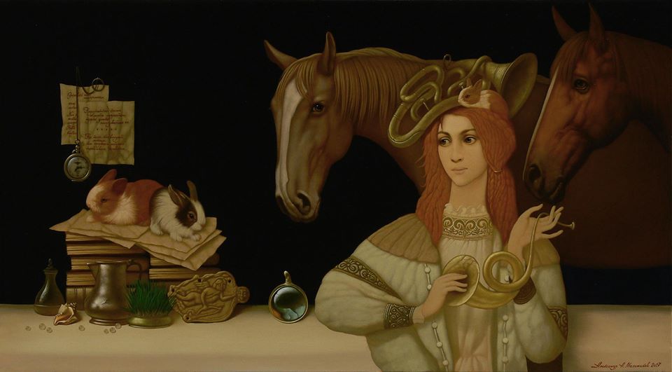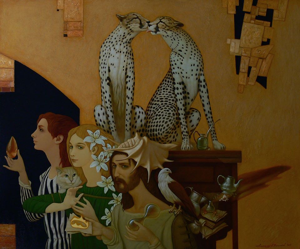 Картины Александра Мельникова наделены особой силой и моментально магнетизируют, стоит бросить на них один лишь взгляд. Внимание способны зацепить многие детали и элементы. Будь то грозный леопард или почти что домашний белый носорог. Впрочем, животные присутствуют практически в каждой картине Александра Мельникова и могут считаться теми самыми «ключами», которые дают многие подсказки в непростом мире символики и романтики Александра Мельникова.