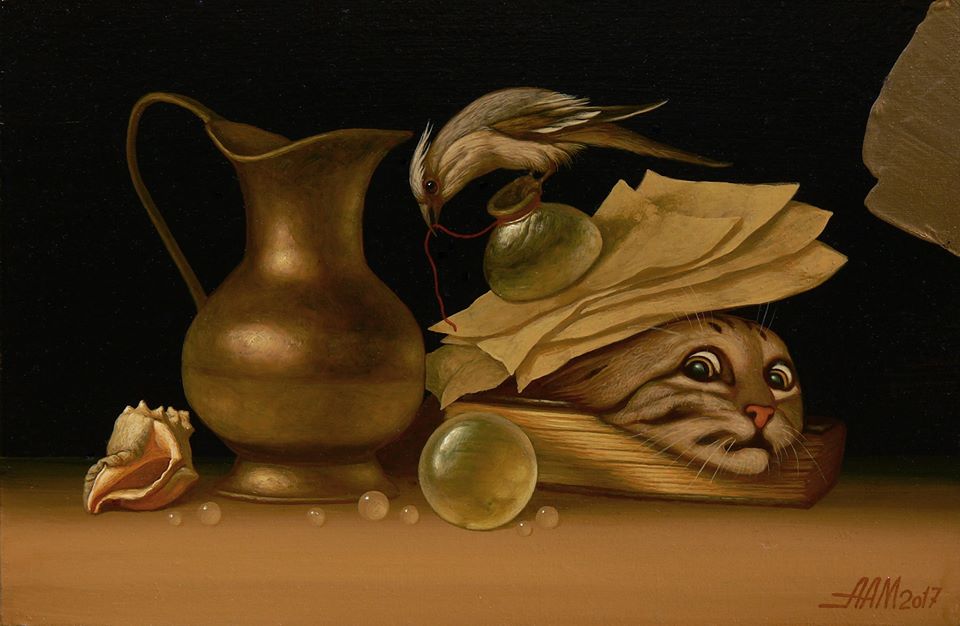Натюрморт – отдельная страница творческой биографии Александра Мельникова, хотя, на редком холсте художника события разворачиваются не на фоне натюрморта. Состав натюрморта практически одинаков – металлические сосуды, стеклянные шары, цветы – и переходит из картины в картину все с тем же тонким намеком на события, чувства и эмоции, в которые вовлечены герои картин Мельникова. Чуть было не обмолвилась «романов Мельникова», хотя такая формулировка была бы близка духу и настрою автора. Мельников – автор глубокого и проникновенного рассказа, истории, легенды, которую можно прочитать, домыслить и преобразить. Художник позволяет зрителю быть самостоятельным и не торопиться открывать карты и давать ключи к пониманию работ – во многом следует поработать, чтобы понять мир бесподобных образов, грации и потрясающего мастерства Александра Мельникова.