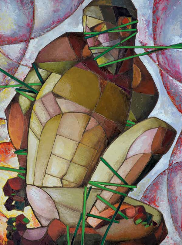 Впрочем, мне видится за этим то, что обычно принято называть словом «протест». Не хотелось бы связывать это с тем, что помимо творческой работы, художница – хранительница очага большого и дружного семейства, заботливая и внимательная мать. В том, что условно можно назвать «протест» есть некая мистическая и загадочная подоплека, раскрывать которую следовало бы с подхода к характеристике системы общечеловеческих ценностей, культивируемых, а то и насаждаемых в мире. То, что современное общество превратилось в общество потребления – не вызовет ни малейшего сомнения. Страстный и сексуальный, экспрессивный и динамичный, безудержно рвущийся вперед к достижению цели – таковым предстает сегодня мир. Так каков он на самом деле? Дарующий воплощение желаний или обрекающий на диктат мегаполисов и следование не всегда свойственным человеку гипер-потребностям? Не отсюда ли и картины Оксаны Кирпенко – «Связанные», «Мучение», «Крик»? И бегство в работах (диптих «Побег», «Вознесение»), как единственный способ спасения из пут культа, связывающего по рукам и ногам, обрекающего на вечное следование кем-то выдуманным и навязанным идеалам. Художница удивительно тонко, на интеллектуальном уровне чувствует ту среду, в которой находится и блестяще, с присущей ей иронией и мудростью воспроизводит посредством языка изобразительного искусства те реалии, с которыми пришлось столкнуться. При этом – ни малейшей фальши или лжестыдливости, которая словно фиговым листком прикрывает нежелательное для посторонних глаз действо. Все – точно, честно, открыто и прочувствованно. И, самое главное – Оксана Кирпенко не уходит от традиционной и воспринятой с детства темы чеховского «маленького» человека.