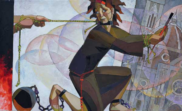 Хотя одна из работ явно вырывается из общего стройного ряда «серийности» и претендует на выборочность. «Мучения Брунеллески» – большая картина, по своим масштабам тяготеющая к монументальным росписям, но, по сути, являющаяся иллюстрацией, рассказом и буквально насыщена драматизмом и символикой. Вполне понятно, что эта тема возникла после прошлогоднего визита художницы в Италию. От историков, по счастью, не утаились многие этапы строительства знаменитого флорентийского собора Santa Maria del Fiore – символа новой эпохи Возрождения, каковым он и задумывался. Известно, что возведение купола было поручено великому зодчему и скульптору того времени Филиппо Брунеллески, и что работа над его сооружением была сопряжена с постоянными поисками и сомнениями. Все эти факторы в совокупности предполагали, что в картине будет присутствовать конфликт, как неизменная составляющая больших свершений. Но которые из факторов остались неизвестными человечеству? Художница словно раскрывает перед нами неизведанные ранее страницы и неожиданно вводит женский образ, отдаленно напоминающий саму Оксану Кирпенко. Гиря на ноге и поводок на шее подталкивают к пониманию явно непростого и неоднозначного пути художника в обществе. Впрочем, сама художница прокомментировала эту работу несколько пространно, считая, что это может перерасти в большую новую серию картин.