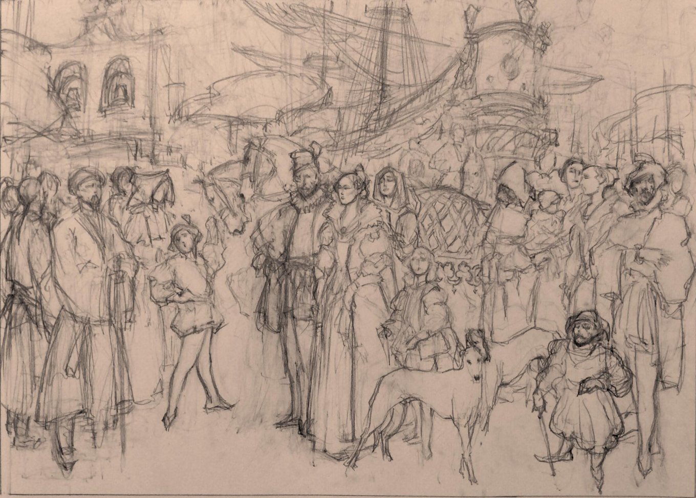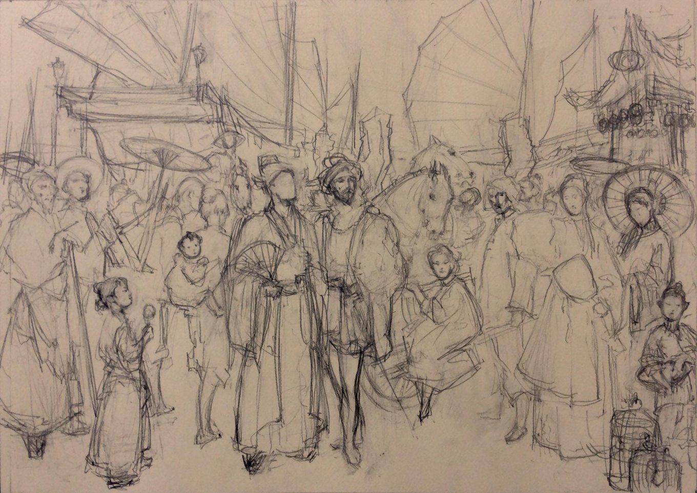 Левая часть триптиха "Большой Шелковый путь" - Европейцы в Поднебесной (фрагмент). 280х200