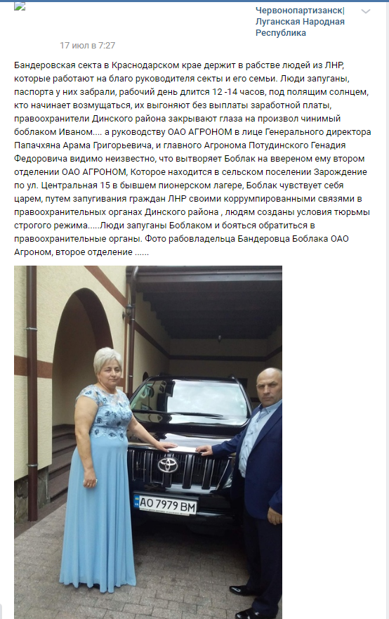 "Бандеровская секта в Краснодарском крае держит в рабстве людей из ЛНР, которые работают на благо руководителя секты и его семьи. Люди запуганы, паспорта у них забрали, рабочий день длится 12 -14 часов, под полящим солнцем, кто начинает возмущаться, их выгоняют без выплаты заработной платы, правоохранители Динского района закрывают глаза на произвол чинимый боблаком Иваном…. а руководству ОАО АГРОНОМ в лице Генерального директора Папачхяна Арама Григорьевича, и главного Агронома Потудинского Генадия Федоровича видимо неизвестно, что вытворяет Боблак на ввереном ему втором отделении ОАО АГРОНОМ, Которое находится в сельском поселении Зарождение по ул. Центральная 15 в бывшем пионерском лагере, Боблак чувствует себя царем, путем запугивания граждан ЛНР своими коррумпированными связями в правоохранительных органах Динского района, людям созданы условия тюрьмы строгого режима…..Люди запуганы Боблаком и бояться обратиться в правоохранительные органы. Фото рабовладельца Бандеровца Боблака ОАО Агроном, второе отделение, прошу принять меры и осудить бандеровскую секту, а предприятие национализировать".