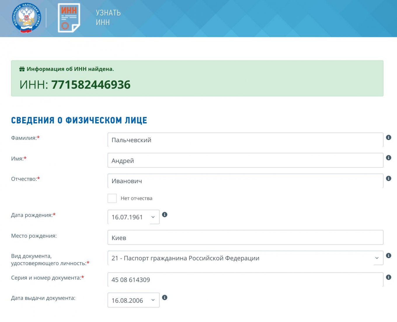 Подлинность документа легко проверить - достаточно вбить серию и номер паспорта на сайте российской налоговой службы, и там подтверждается, что такой гражданин действительно есть. Выдается и ИНН Пальчевского - 771582446936