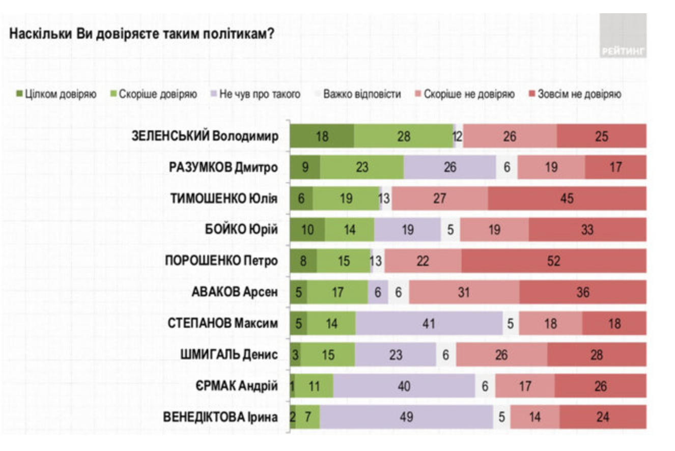 При цьому, недавні суперники Зеленського на останніх президентських виборах користуються значно меншою довірою народу. Зокрема, лідеру ВО «Батьківщина» Юлії Тимошенко довіряють 25%, 72% не довіряють (у вересні їй довіряли – 22%, не довіряли – 74%). Співголові «Опозиційної платформи – За життя» Юрію Бойку довіряють 24%, 52% не довіряють (довіряли – 24%, не довіряли – 58%). Лідеру «Європейської Солідарності» Петру Порошенку довіряють 23%, 74% не довіряють (довіряли – 22%, не довіряли – 75%). Цікавим залишається той факт, що Порошенку не вдалося значно знизити свій антирейтинг — він вже тривалий час залишається найвищим серед топполітиків країни.