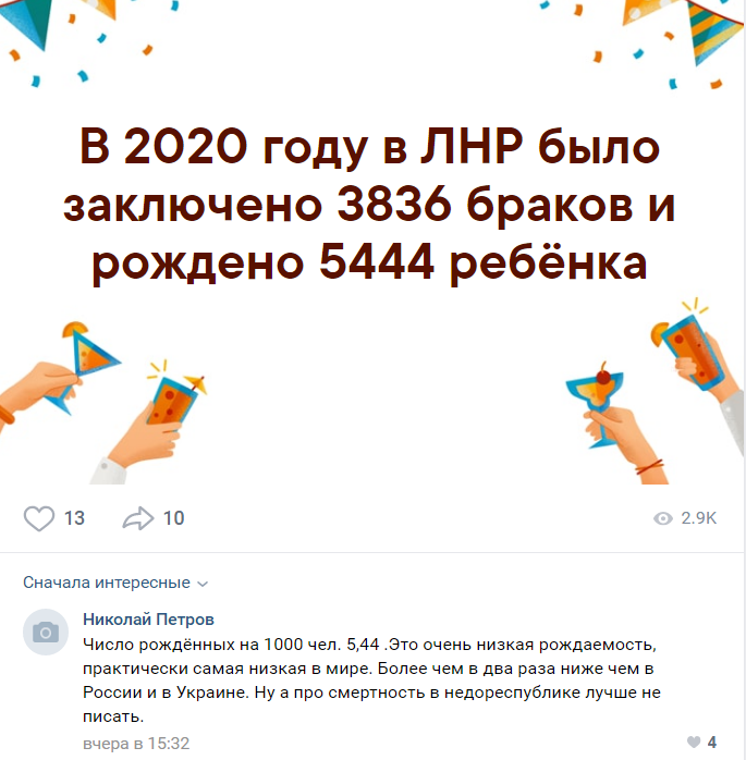 4 марта 2021 года, в отделе записи актов гражданского состояния Департамента государственной регистрации Министерства юстиции Донецкой Народной Республики сообщили, что за период с 1 января по 3 марта 2021 года территориальными отделами ЗАГС Республики было составлено 1 346 записей актов о рождении, из них 686 записей актов о рождении мальчиков и 660 — о рождении девочек.