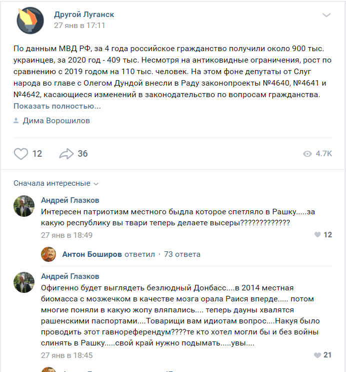 За тех жителей ОРДЛО, кто имеет 3 паспорта, я вообще говорить не хочу, а нужно. Это самое мерзкое что там есть. И это мерзкое выгрызет себе все до чего дотянется. Это держатели "акций", то есть те, кто имеет паспорт гражданина Украины, паспорт гражданина РФ, "паспорт гражданина республики".
