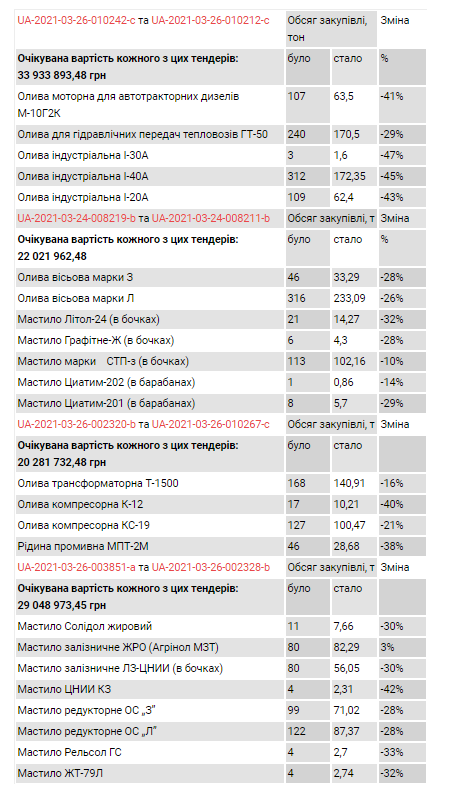 Отже у березні «Центр забезпечення виробництва» оголосив низку тендерів на постачання десятка видів різних мастил та олив. Їх розподілили між цими тендерами так, щоб ніхто ззовні не міг визначити очікувану вартість товару звичайним шляхом – поділити ціну закупівлі на загальну вагу.