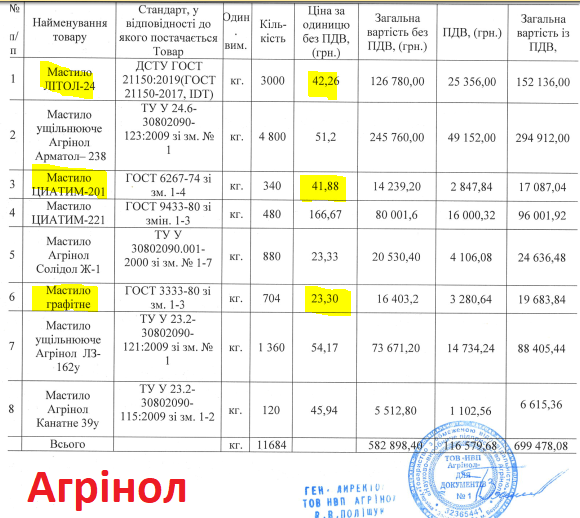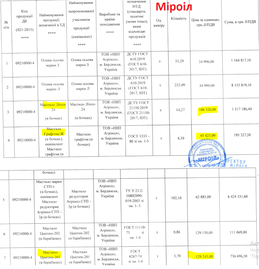 Отже стартова сумарна пропозиція «Міроіла» по семи видам мастил виробництва «НВП «Агрінол» – 21,97 млн грн, це майже точно дорівнює очікуваній ціні тендеру 22,02 млн грн. Тобто заявлені «Міроілом» ціни за окремі мастила у сумі відповідали очікуванням залізничникам. Однак ці ціни на фоні інших закупівель просто скажені.