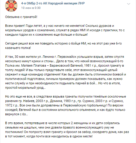 Цитата: "Обезьяна с гранатой! Всем привет! Годи летят, а у нас ничего не меняется! Сколько дураков и моральных уродов к сожалению, служат в рядах НМ! И исходя с практики, то с каждым годом их к сожалению еще больше и больше!Сегодня решил все же поведать историю о бойце НМ, но на этот раз уже 6-го казачьего полка!И так, 30 мая жители ул. Ленина г. Первомайск услышали взрыв, затем спустя несколько минут крики и стоны… Дело в том, что некий военнослужащий 6-го Полка им. Матвея Платова – Барановский Евгений, 1981 г.р., бросил гранату в толпу людей! И вы только представьте себе, этот военнослужащий целый сержант и еще командир отделения! Как бы должен быть отличником боевой и политической подготовки, личным примером должен показывать, как нужно нести службу и при необходимости подымать парней в бой… Но что в итоге, простой моральный урод…