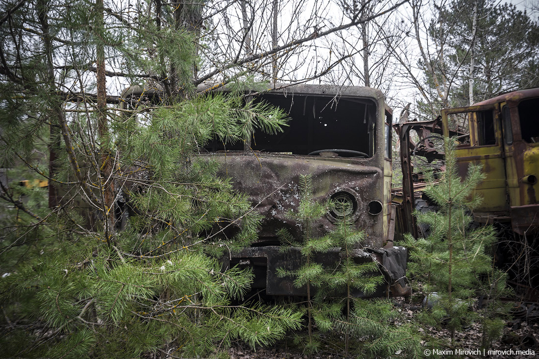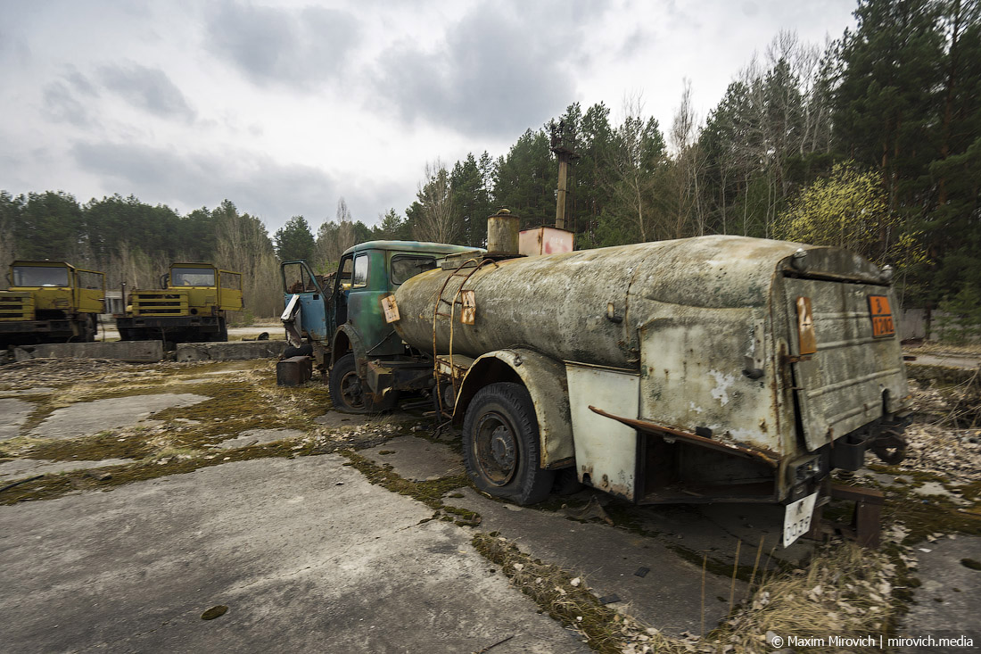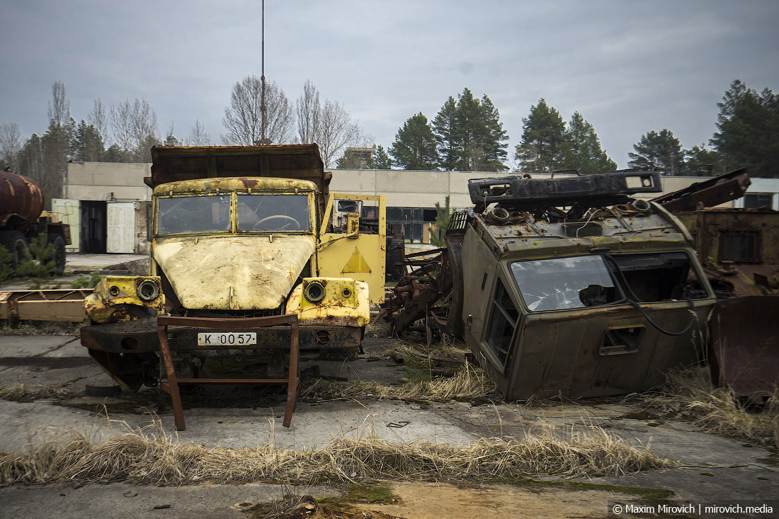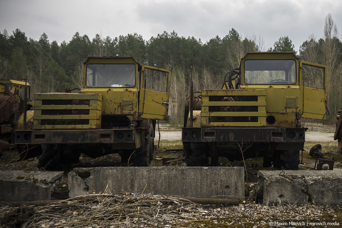 Заходим на территорию ПМК. Это довольно большая площадка у леса на окраине Припяти, выложенная бетонными аэродромными плитами. Именно здесь, на условно охраняемой территории, сейчас можно увидеть наиболее сохранившиеся остатки техники ликвидаторов — администрация Зоны отчуждения принимает меры, чтобы она сохранилась хотя бы в каком-то виде.