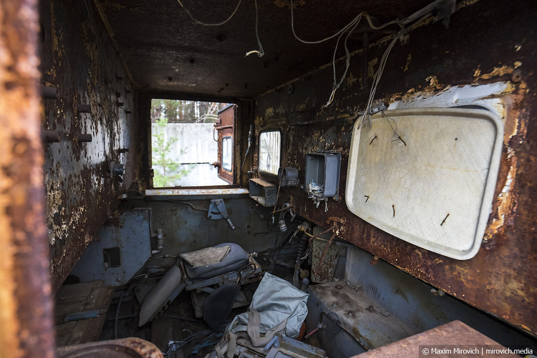 Вид кабины этого загадочного монстра изнутри. Всё ценное оборудование, разумеется, давно снято. Между остатками двух кресел валяются остатки серого костюма ОЗК с характерными лямками-завязками и хорошо заметной застёжкой-затяжником, которая обычно фиксировалась чёрными пластиковыми пуговицами, называемыми "пуклями" или "шпеньками". А ещё обратите внимание на окно в передней части снимка — оно закрыто обычным пластиковым подносом из столовой. Судя по всему — в последние недели или дни работы техники стекло окна разбилось, и для хоть какой-то защиты от пыли и бета-частиц операторы приделали к проёму этот поднос.