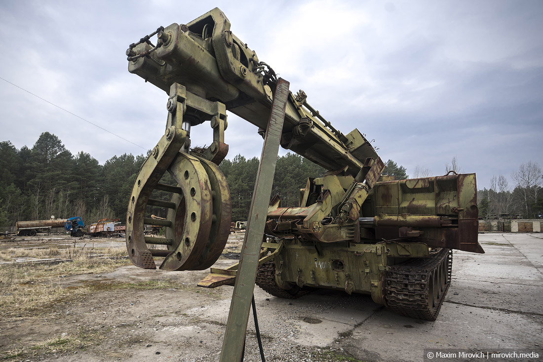 Обратите внимание на захват ИМР-а на фото, он поддерживается импровизированной сварной стойкой — эти меры предпринимает администрация Зоны отчуждения для того, чтобы машина сохранялась в более-менее приличном виде и не развалилась раньше времени.