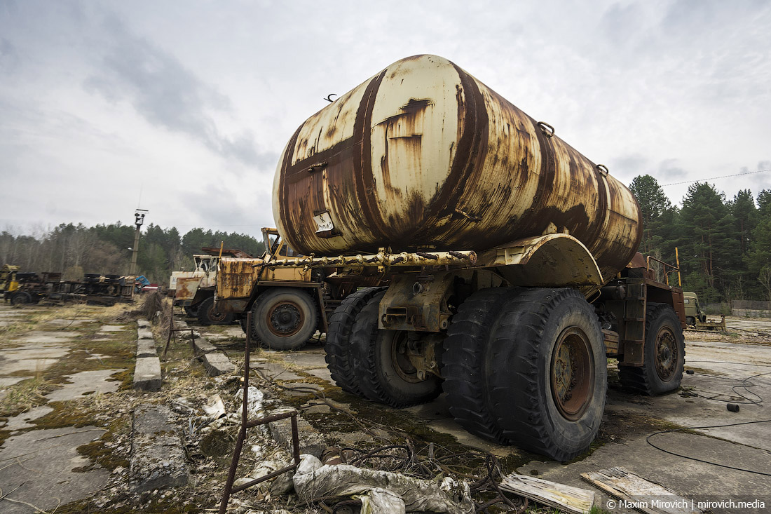 Остатки цистерны на базе ЗИЛ-130, которая тоже использовалась в работах по дезактивации. Характерная цистерна как бы "прямоугольного" сечения говорит о том, что это была не ёмкость для перевозки ГСМ, а поливомоечная машина — вы могли такие ещё застать на улицах в последние годы СССР и в ранние девяностые годы. Объём цистерны составлял примерно 5-6 тысяч литров воды — что конечно не так впечатляет, как гигантская цистерна на БелАЗе, но тоже кое-что. Кроме того, у ЗИЛа-130 была электрощётка, что позволяло эффективно поднимать радиоактивную пыль на улицах Припяти и смывать её в ливнёвую канализацию.