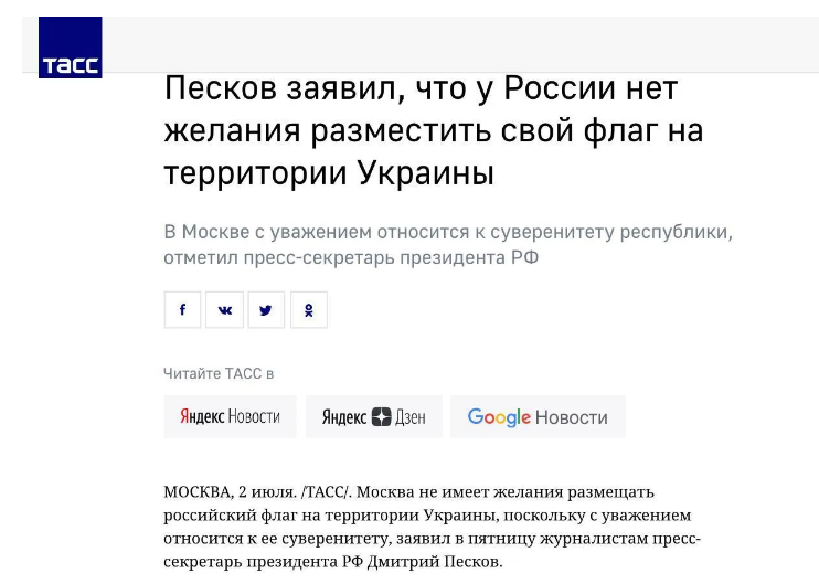 Пресс-секретарь президента РФ Дмитрий Песков заявил, что "Россия с уважением относится к суверенитету Украины и не имеет желания разместить свой флаг на ее территории".